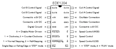 The EDE1204 Bi-Polar Stepper Motor IC is a 5 volt, 18 pin device designed to control any bi-polar stepper motor. The EDE1204 is capable of automatically turning a stepper motor in 'RUN' mode and of external pulsing in 'STEP' mode. Directional control is available, as well as both full and half-stepping for increased control resolution. The TTL/ CMOS level outputs sequence the stepper drive components, which consist two H-Bridges - either from discrete transistors or using the L293 Dual H-Bridge IC. Complete hookup schematics are contained in the datasheet.