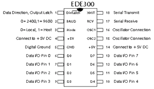 The EDE300 Parallel/ Serial Transceiver IC is a 5 volt, 18 pin device designed to conveniently convert 8-bit parallel data into serial format and vice-versa. The EDE300 is ideal for logging data to a PC, controlling hardware via the PC serial port, communicating 8-bit data via a serial connection, and expanding the I/O capabilities on microcontrollers and Stamps. The EDE300 is BAUD-selectable, offering both 2400 and 9600 BAUD communication. PC connection requires the use of a voltage level shifter such as the MAX233. The EDE300 can be configured as either a half-duplex transmitter, a half-duplex receiver, or a half-duplex bi-directional transceiver.