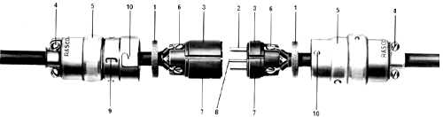 1. Dust-proof-On clamp type plugs and connectors a thick sponge rubber washer is provided in each cap, to be forced over the cord. This serves as a bushing and also as a shield to exclude metal particles, dust, etc., from interiors of plugs and connectors.