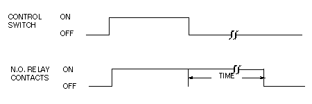 • DELAY ON RELEASE - Input voltage must be applied continuously to operate the internal relay. When the control switch is closed, the relay energizes. When the control switch is opened, timing begins. When timing is complete, the relay will de-energize. Time may be reset to zero during timing by closing the control switch.